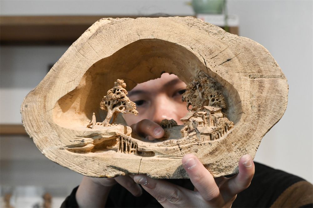 3月18日,广东省潮州市,郭少俊儿子郭奕辉展示他用一块朽木创作的潮州木雕《知足》。