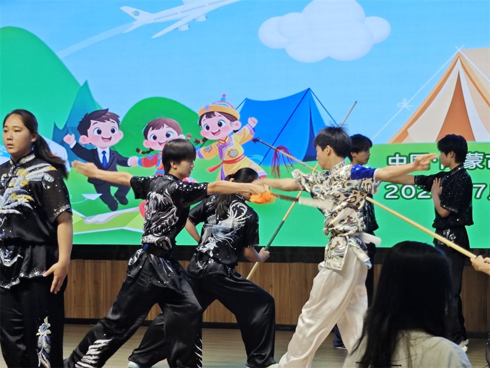 7月13日,2025“亲情中华·中国寻根之旅”夏令营内蒙古营开营仪式上的武术表演。(图片来源:中新社)