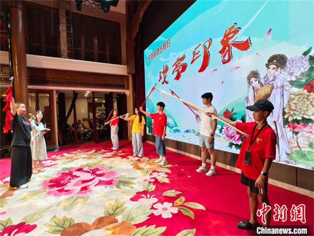 2025年“亲情中华·中国寻根之旅”夏令营(风韵南粤广东汕头营)9日至16日在汕头市举行,11日晚,来自西班牙、美国等国家的华裔青少年亲身体验潮剧表演。(图片来源:中新网)