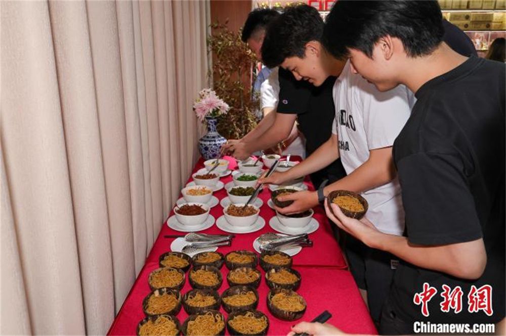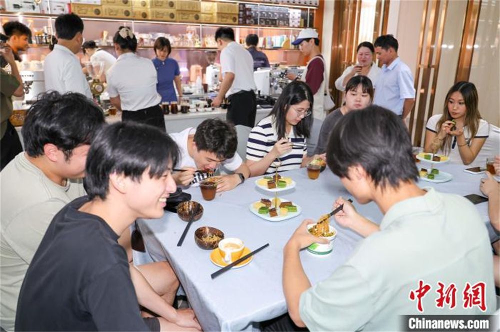 7月11日,海外华裔大学生在海南省华侨商业学校品尝自己制作的海南粉。(图片来源:中新网)
