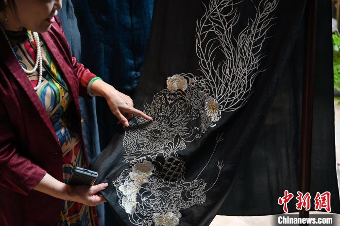 7月16日,王雪在广州市锦纶会馆展示香云纱上的潮绣图案。