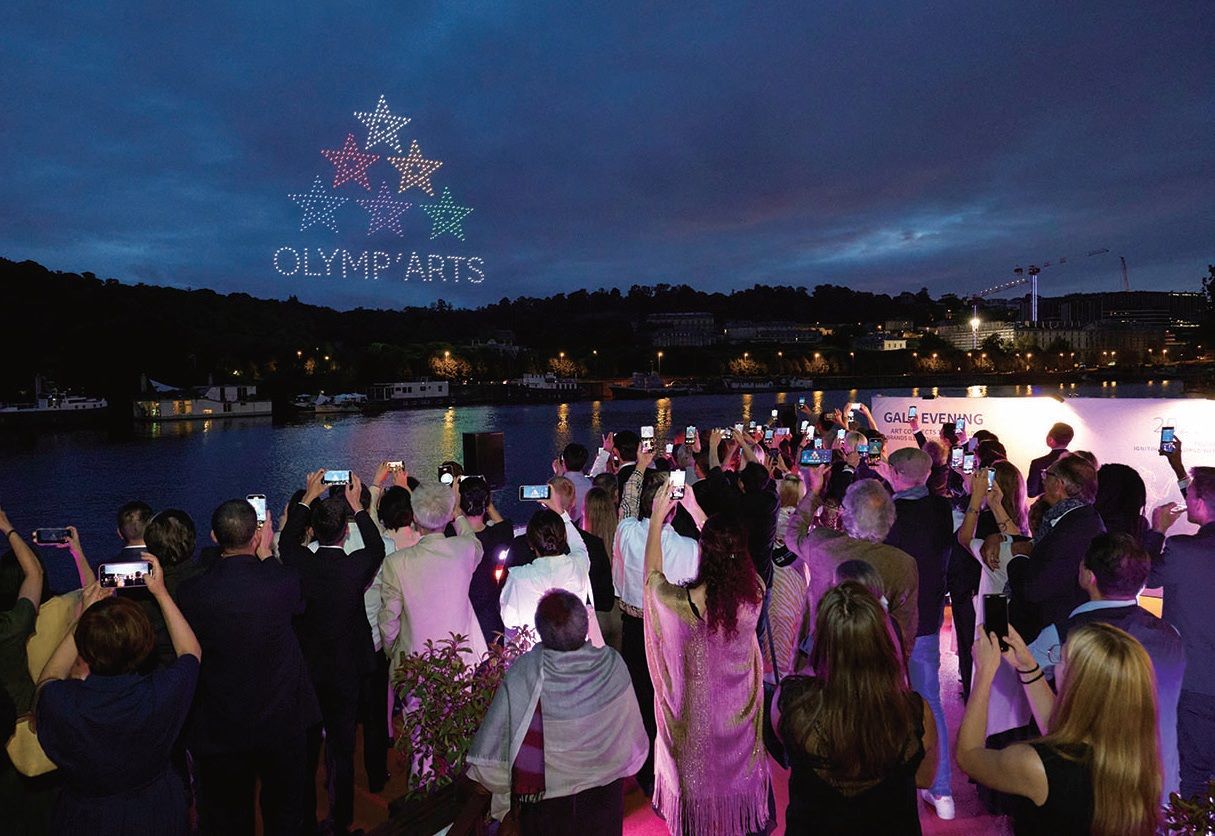 夜幕降临,中国无人机团队在塞纳河上空呈现灯光表演,千架无人机组成的“Olymp’Arts”标识点亮夜空,将气氛推向高潮,生动诠释“艺术连接世界”主题。