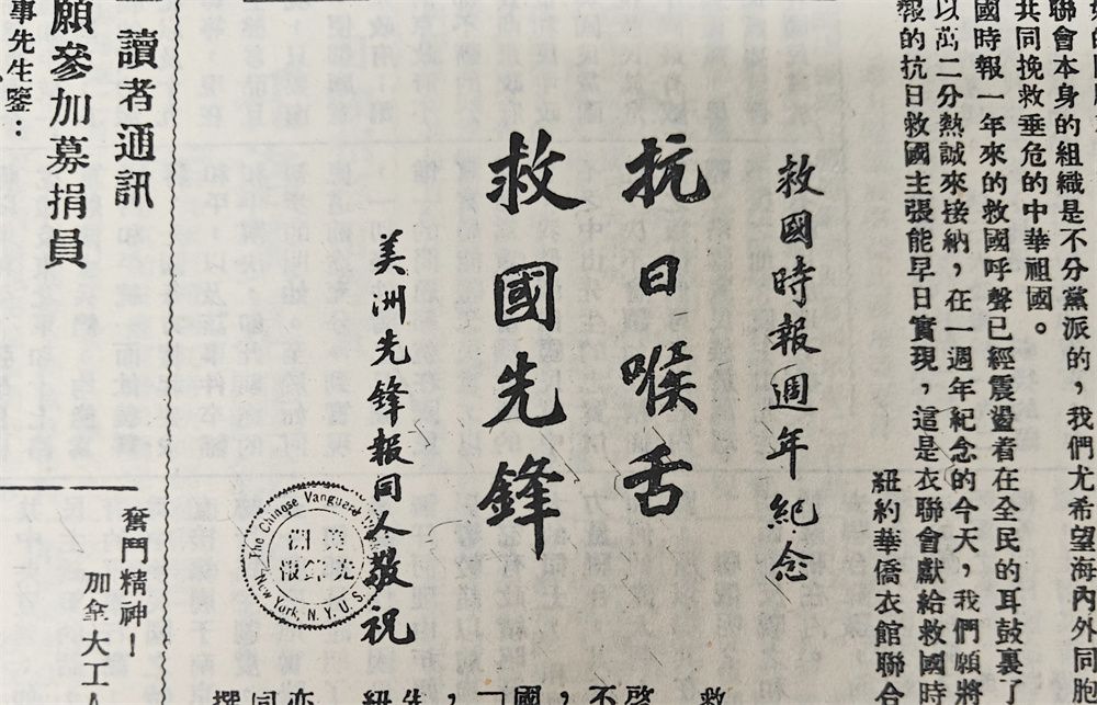 《救国时报》创刊周年纪念时,美洲《先锋报》评价其为“抗日喉舌,救国先锋”。(图片来源:受访者供中新社)