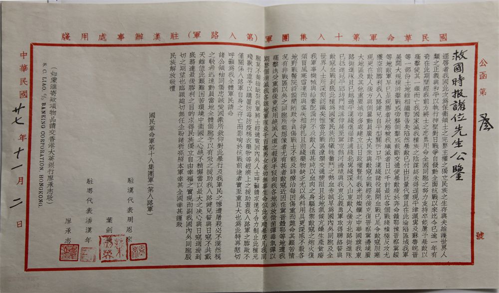 1938年11月2日,国民革命军第八路军写给《救国时报》的信(复制件)。(图片来源:受访者供中新社)