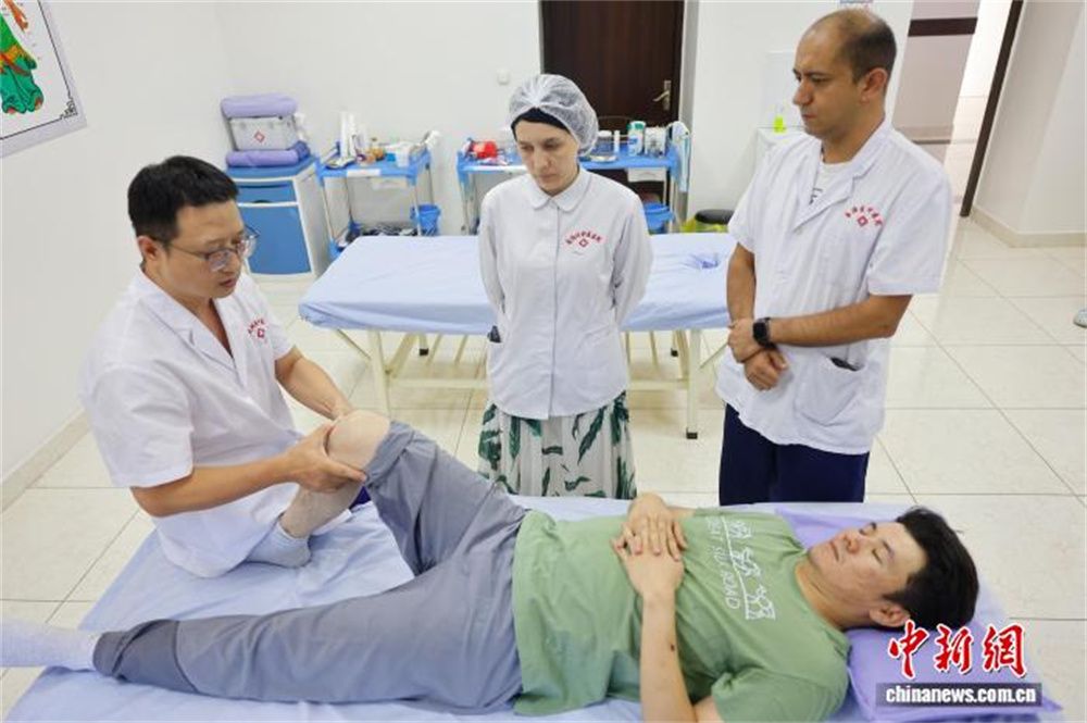 7月21日,中乌中医药中心副主任医师王波(左一)正在做膝关节查体的示范。(图片来源:中新网)