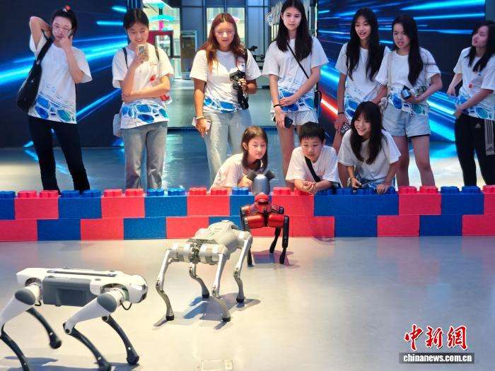 8月5日,北京亦庄机器人大世界,华裔青少年观看机器狗表演。(图片来源:中新网)