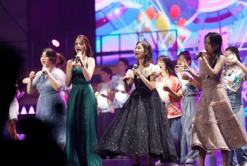 2025年8月8日,海外赛区少年组银奖获得者袁一诺(前右二)等选手一起晚会现场演唱《小城夏天》。