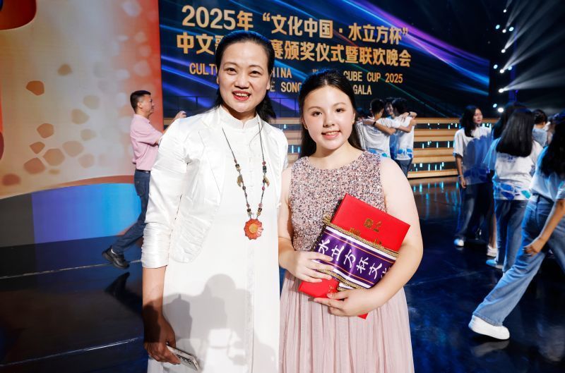 2025年8月8日,获得本届“水立方杯”年度文化使者的英国分赛区选手谢佩里(右)与妈妈谢女士在现场合影。