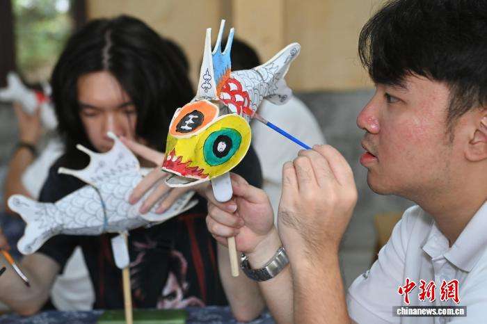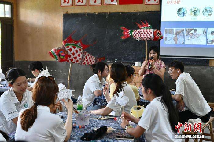 图为华裔大学生在宏村研学基地体验制作鱼灯。