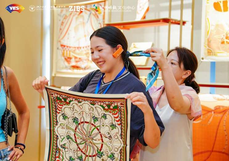 8月11日上午,学生们参访万事利,感受中国传统丝绸文化。在万事利门店中,参访团师生精心选购丝绸制品,这份来自故乡的礼物将远渡重洋,回到远方的家人身边。