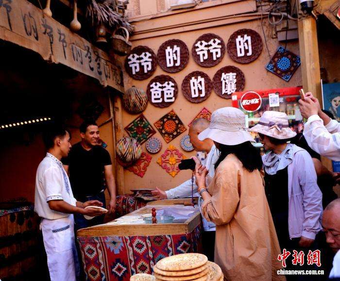 图为嘉宾在喀什古城食品店铺打卡拍照。