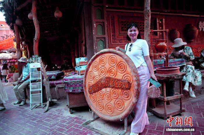 图为嘉宾在喀什古城店铺前与一个食品造型的雕塑合影。