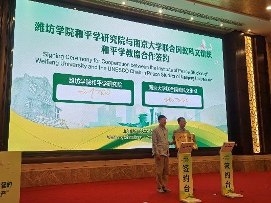活动由潍坊市委副书记郭飞主持。随后,潍坊学院和平学研究院与南京大学联合国教科文组织和平学教席签订合作协议,由南京大学和平学教席主持人刘成教授为潍坊学院“国际和平城市·潍坊和平教育教学实践基地”授牌。中国华侨出版社向潍县西方侨民集中营旧址博物馆捐建“侨心书苑”。
