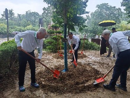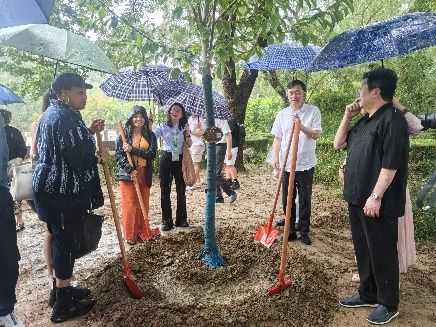 国际和平城市协会副主席阿约·阿尤拉·阿玛莱(左一),国际和平城市代表达琳·杜瓦隆(左二)和嘉宾们一起种下和平与友谊之树。