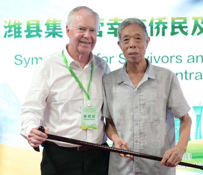 韩崇滨也80多岁了,他向幸存侨民查理·斯坦利赠送了自己女儿亲手制作的潍坊非遗红木嵌银“百寿杖”。他表示,赠送百岁杖是希望查理·斯坦利身体康健,更象征着和平与友谊如这手杖一样,坚实、长久,代代相传。这两位80多岁的老人开心拥抱,也将心中对于和平的愿景传达给了彼此。这一刻,他们像他们的父辈当年那样,跨越了语言和国界,因人与人之间的友善和真诚而聚在一起。