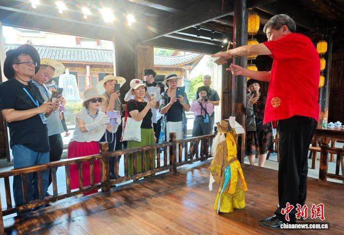 9月16日,海外华文媒体代表在福建省柘荣县富溪古镇观看提线木偶表演。(图片来源:本文图片均来自中新网)