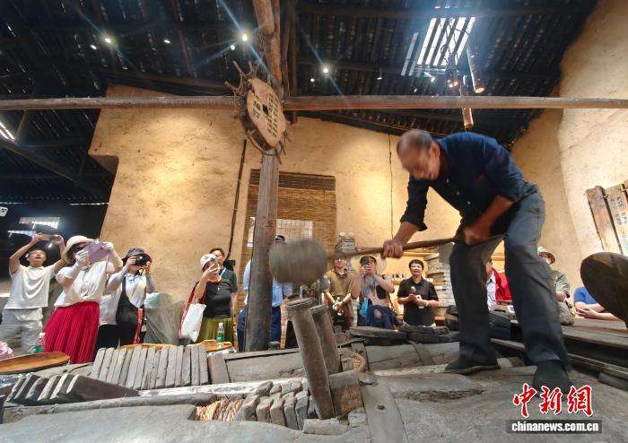 9月16日,福建省柘荣县富溪镇山茶油制作技艺第六代传承人游信玉正在演示传统山茶油制作技艺。