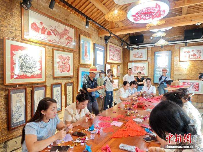 9月16日,海外华文媒体代表与游客一起在福建省柘荣县靴岭尾村体验剪纸工艺。