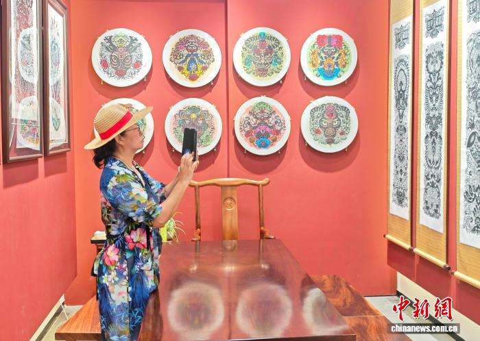 9月16日,委内瑞拉《委侨新闻网》副社长郑海燕在福建省柘荣县靴岭尾村参观剪纸作品。