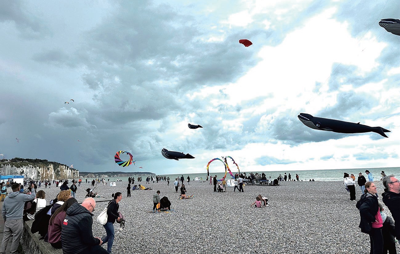 抵达迪耶普后,大家先后参观了港口风光与周末集市,游览了圣雅克教堂与历史古迹,并在幸运草海景餐厅享用地道的诺曼底午餐。下午的自由活动中,协会成员与游客们一同在开阔的沙滩上放飞了来自中国山东潍坊市非遗传承人的传统与创意风筝,正式成为现场“中国民间风筝队”的一员。迎风飞舞的“诺曼底奶牛群”、巨型“蓝色鲸鱼”、“千足巨龙”与“奔腾的千里马”,潍坊风筝与世界各地的奇思妙想交织在一起,令观众叹为观止。在风筝节中国展位上,来自中国潍坊、天津、西安的文创机构展示了龙头风筝、科技变形风筝等作品,吸引了不少侨胞和游客驻足交流。作为风筝文化的发源地,中国元素在迪耶普大放异彩,意义非凡。