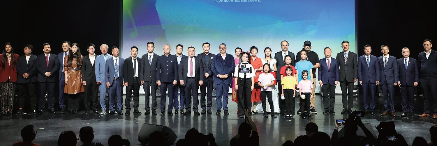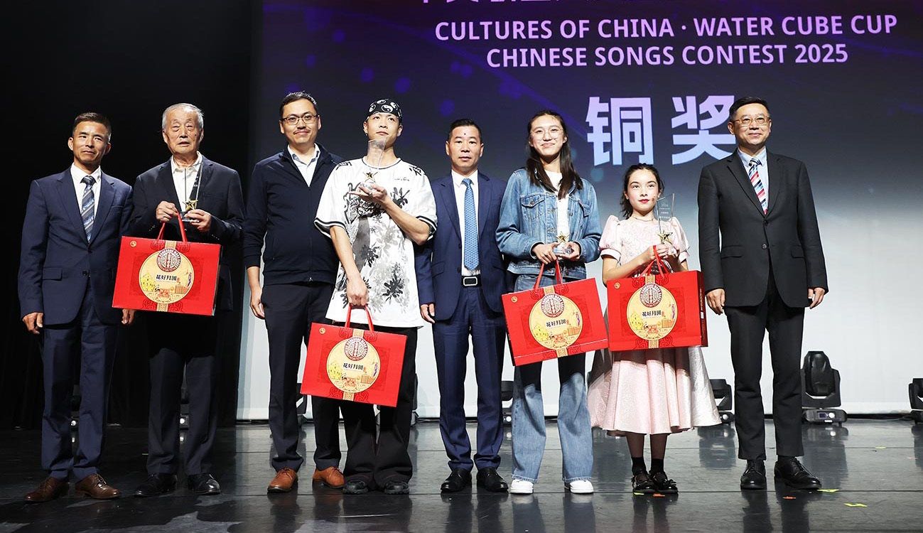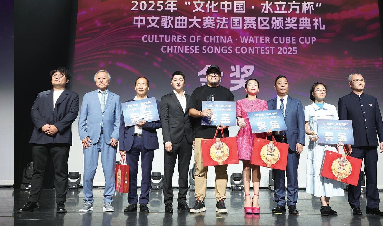 活动现场,邓励、王萌、钟诚、蔡君柱与多位颁奖嘉宾一道,为获得2025年“文化中国·水立方杯”中文歌曲大赛全球总决赛和法国赛区各组别奖项,以及2025年第八届全球华语朗诵大赛奖项的获奖选手颁奖。