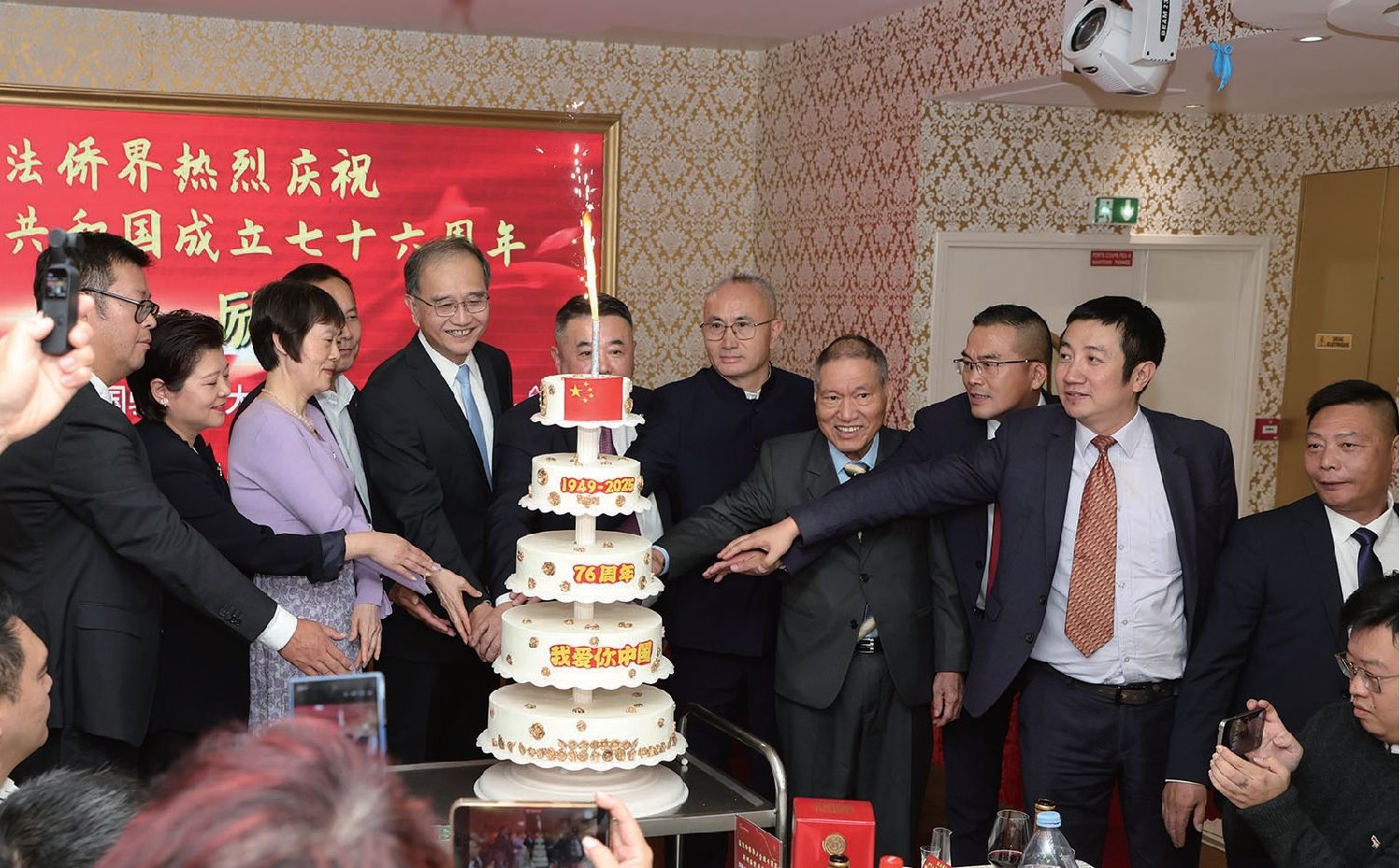 活动现场,邓励夫妇与万磊、蔡君柱、许葵、法国青田同乡会会长周伟、法国法华工商联合会执行会长胡敏、法国中国和平统一促进会常务会长兼秘书长张常豹、法国华侨华人会妇女联合会会长陈岚、法国文成联谊会会长朱良顺、法国中法友谊互助协会常务副会长兼财务长虞冠海等共同切下为庆祝中华人民共和国成立76周年准备的蛋糕。