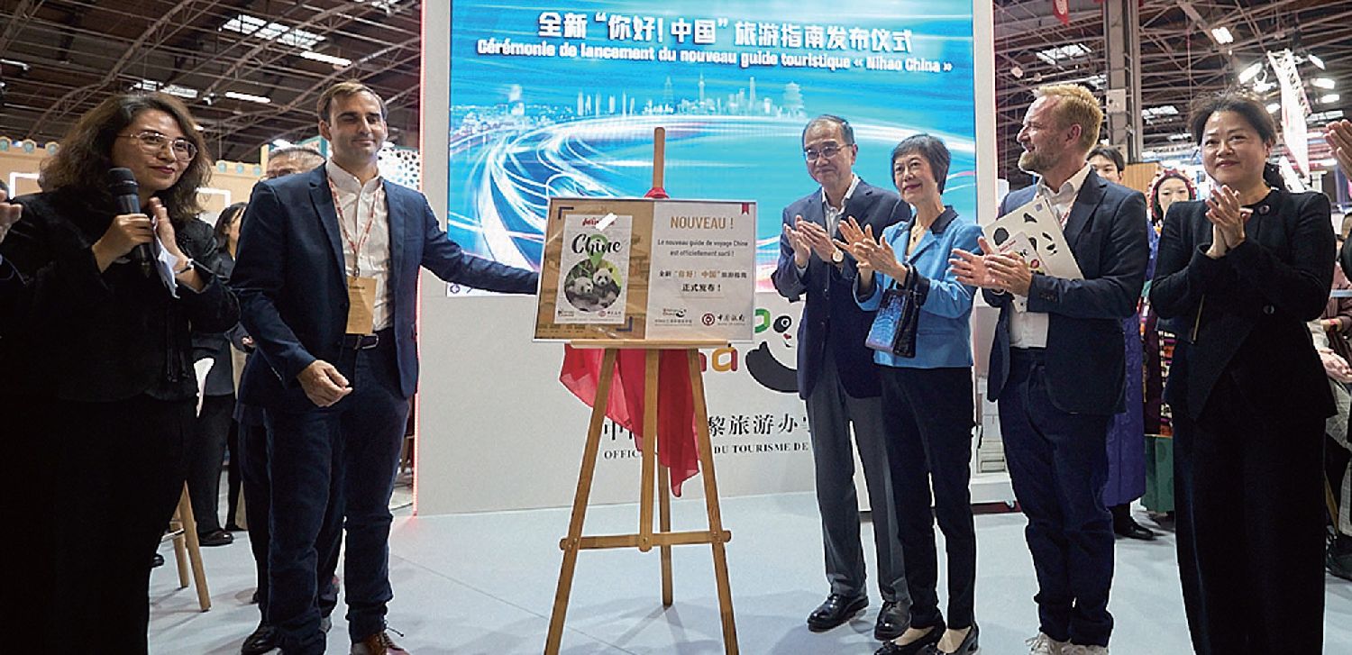 中国驻法国大使邓励和夫人张华出席展台开幕式,并与法国《Petit Futé》杂志总经理路易·欧齐亚斯,法国中国工商会会长、中国银行巴黎分行行长肖亮,中国驻巴黎旅游办事处主任张郝淼、中国东方航空公司欧洲营销中心总经理刘海平共同为2026—2027年法文版《“你好!中国”旅游指南》揭幕。
