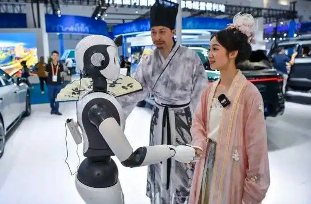2024年4月15日,海南海口,第四届中国国际消费品博览会上,身着汉服的参观者与“柔美人形智能服务机器人”互动。(图片来源:中新社)