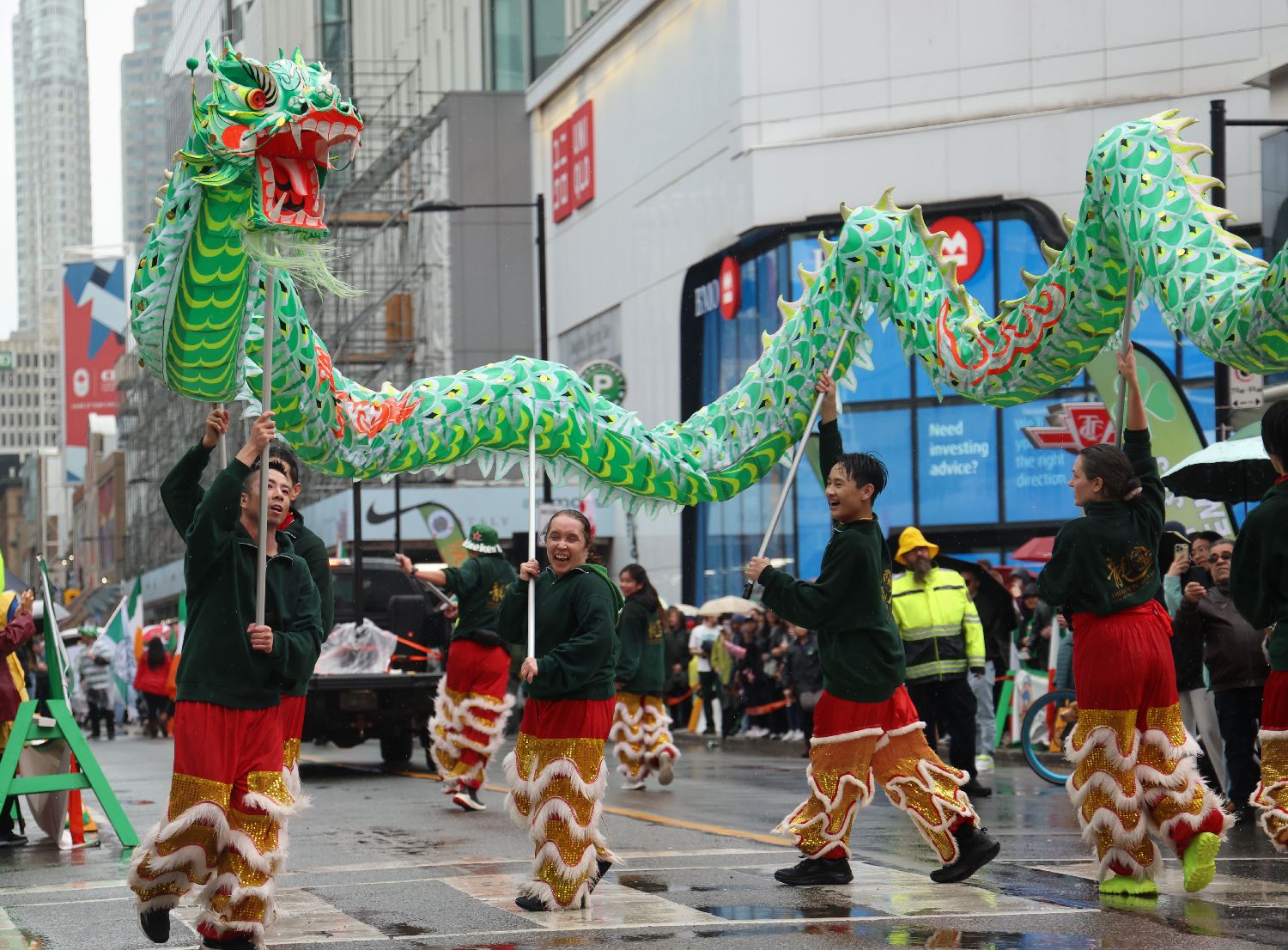 当地时间3月16日,加拿大多伦多,在庆祝爱尔兰民族传统节日圣帕特里克节(St.Patrick’sDay)的大游行中,一支中式舞龙队舞动绿色长龙。(图片来源:中新社)