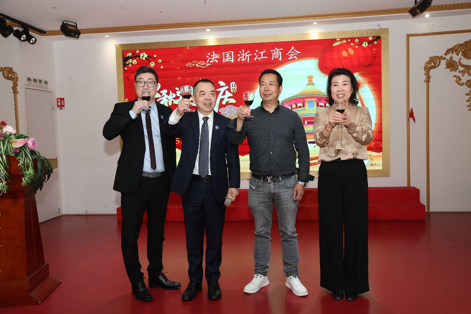 晚宴现场,詹忠与法国浙江商会执行会长胡正千、第一副会长张勇军、秘书长刘长虹共同登台向参加晚宴的协会会员和旅法华侨华人祝酒,送上国庆中秋的双节祝福。詹忠还带领协会骨干成员,向在场人员发放月饼。现场气氛友好热烈,其乐融融,大家共祝伟大祖国国泰民安,同庆中秋佳节。