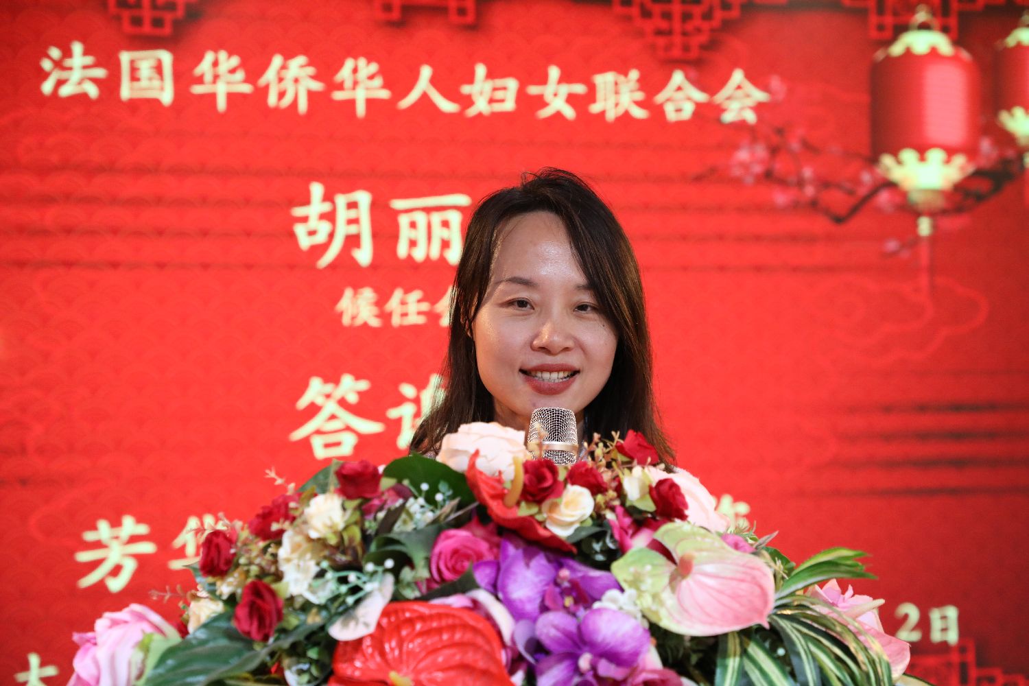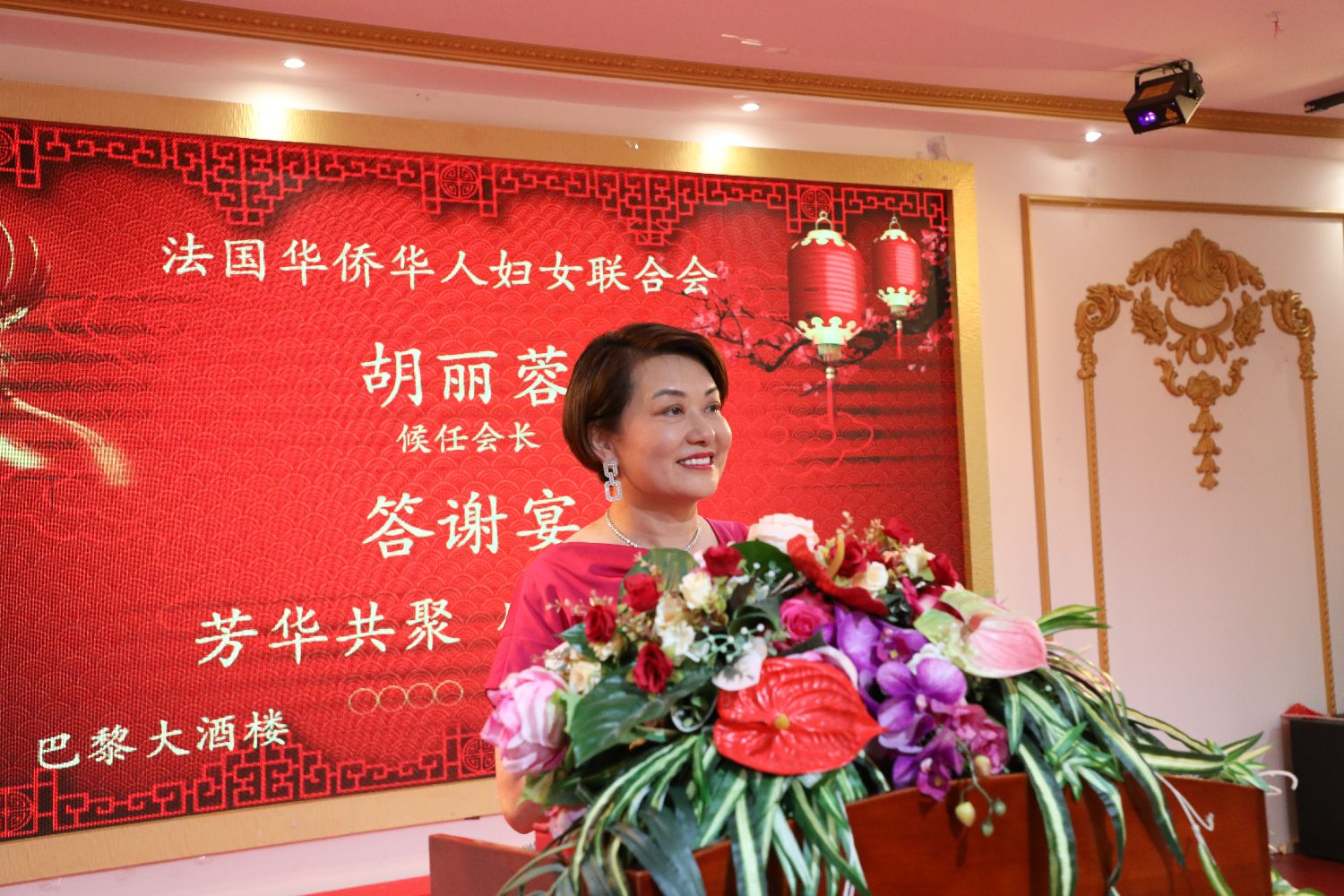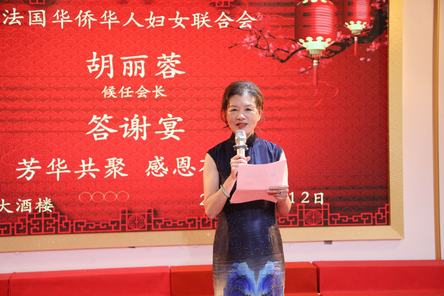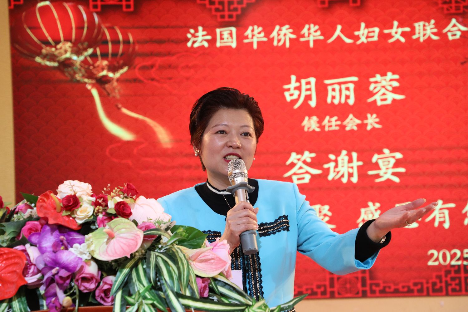 当天的午宴由常务会长林丽华主持,她用诗一般的语言描绘姐妹情深。胡丽蓉致辞表示,答谢既是感恩大家的信任与支持,也是感谢中国驻法使馆长期以来对妇女会的关怀与鼓励。她特别向历届会长致以最深的敬意。正是一代代女性的坚守与奉献,才让妇女会一步步成长为海外姐妹们的港湾与依靠。也要感谢现任会长陈岚——她以智慧和热忱,将妇女会带上了新的高度。她认为,大家推举她为新一届会长。这不仅是一份荣誉,更是一份沉甸甸的责任。“我深知自己还有许多需要学习和提升的地方,但我愿意以最大的热情和努力,延续历届会长的精神,承接陈岚会长打下的坚实基础,与大家一起,把妇女会建设得更加团结、更加有活力、更加有温度。”她寄语新入会的30多位姐妹们,希望大家在这里找到归属感,把妇女会当作第二个家,把我们彼此当作真正的姐妹。无论走到哪里,我们都能互相支持,携手同行。她祝愿在未来的路上,妇女会继续凝聚力量,不仅团结在一起,更要积极走出去,讲好中国故事,展现华人女性的坚韧与优雅。让我们的声音更加洪亮,让我们的身影更加闪耀。“愿我们携手同行,把这个大家庭建设得更加温暖、更加团结、更加有力量。”