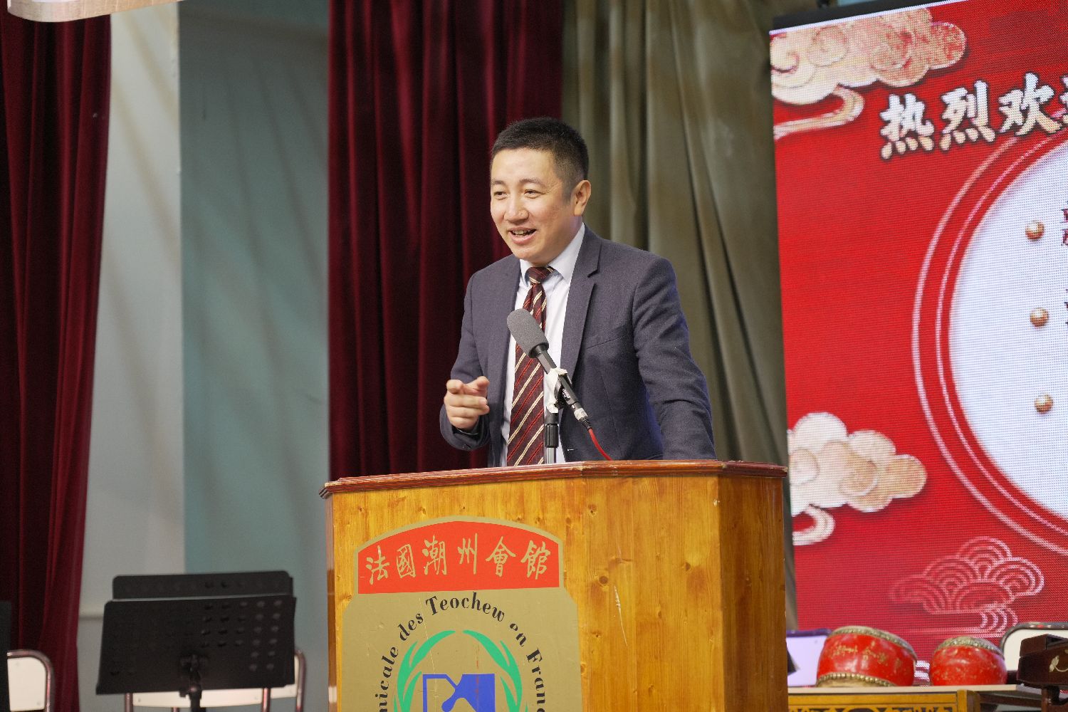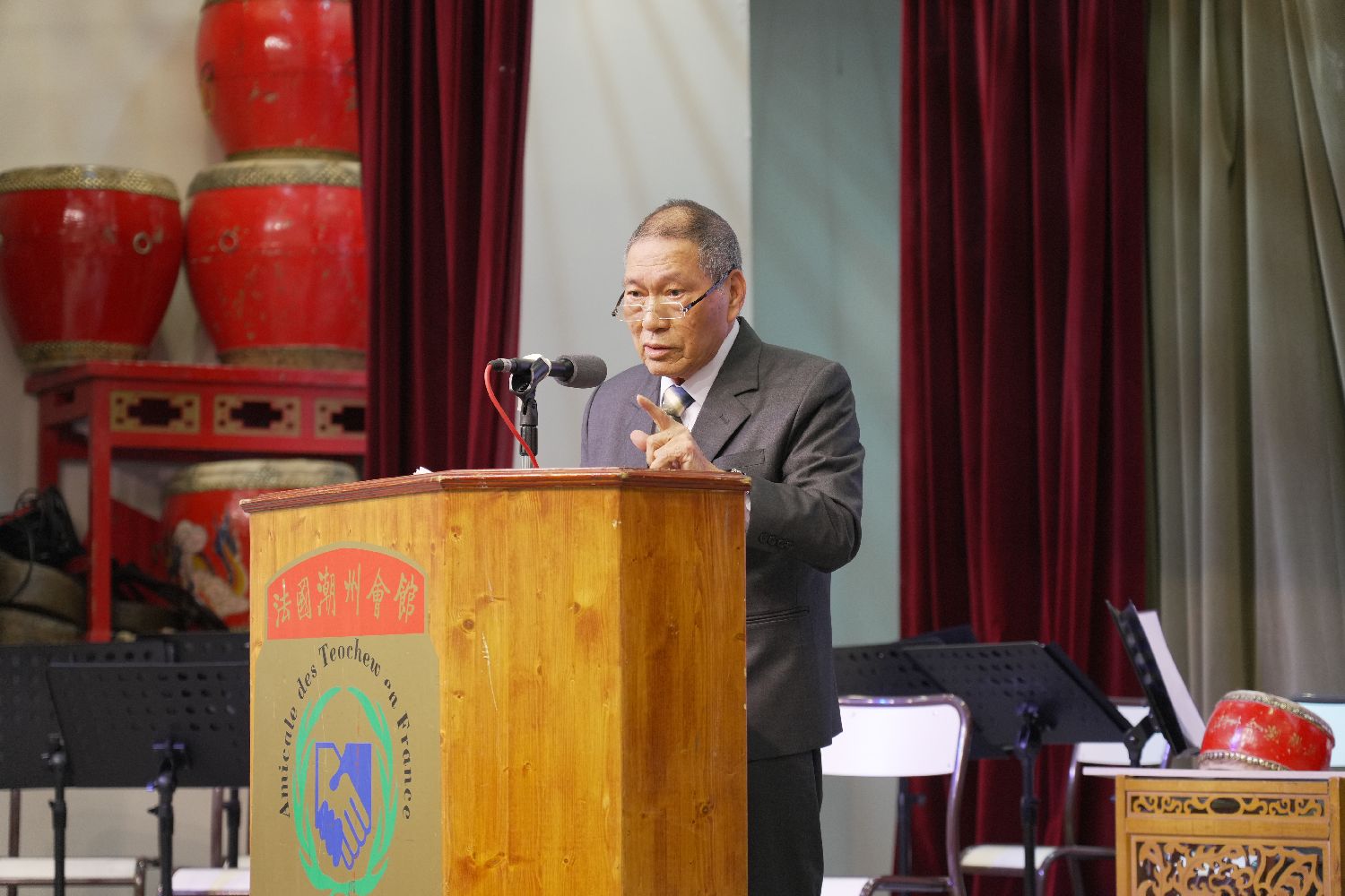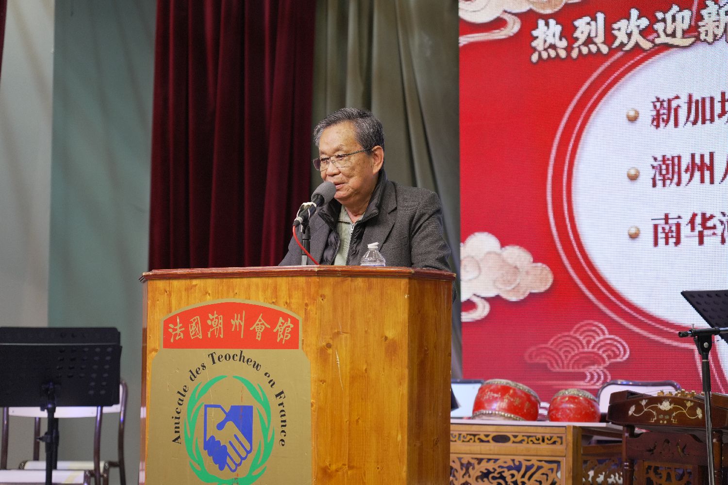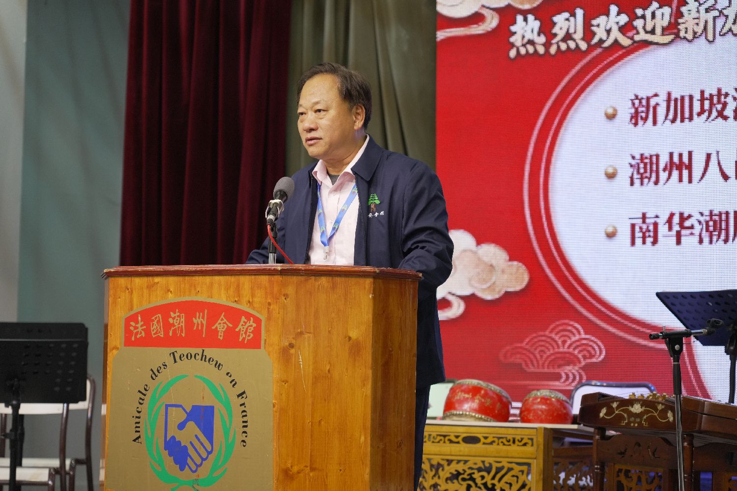 新加坡潮州八邑会馆会长拿督斯里吴木兴回顾了新加坡潮州八邑会馆的地位、历史与使命,并展望未来的合作与盛事。他还表示已成功获得2027年第二十四届国际潮团联谊年会的主办权,并盛情邀请法国潮州会馆的乡亲们届时莅临新加坡给予指导和支持。
