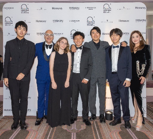 郎朗国际音乐基金会创始人、国际钢琴大师郎朗(右三)、首席执行官卢卡斯•巴文斯基-布朗(左二)、主席Amy Lam(右一)和基金会“青年学者”项目的年轻钢琴家们合影。