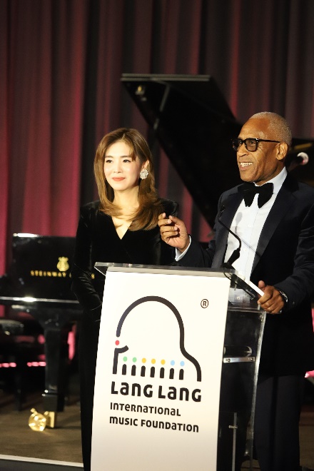 郎朗国际音乐基金会基金会创始人、国际钢琴大师郎朗(左)、首席执行官卢卡斯•巴文斯基-布朗(右)在慈善晚宴上致辞。