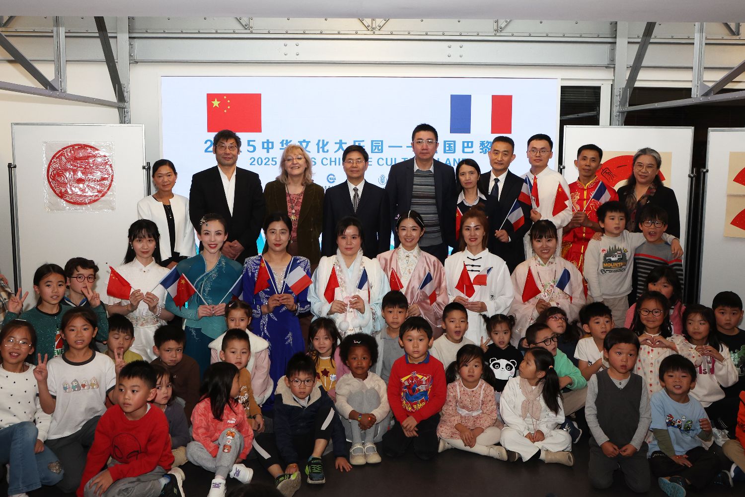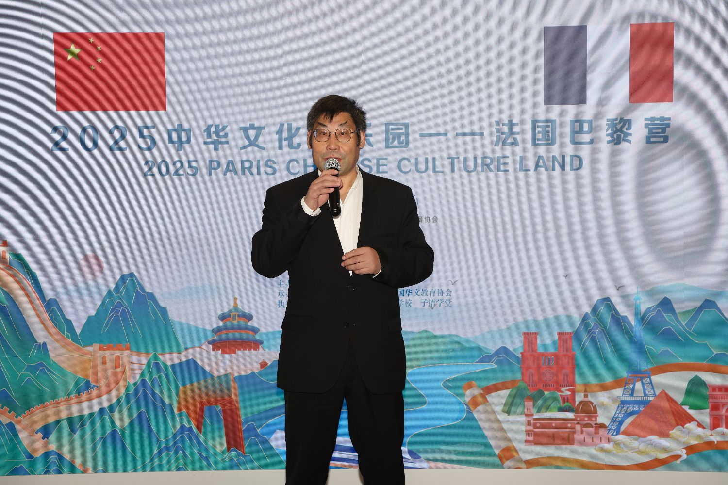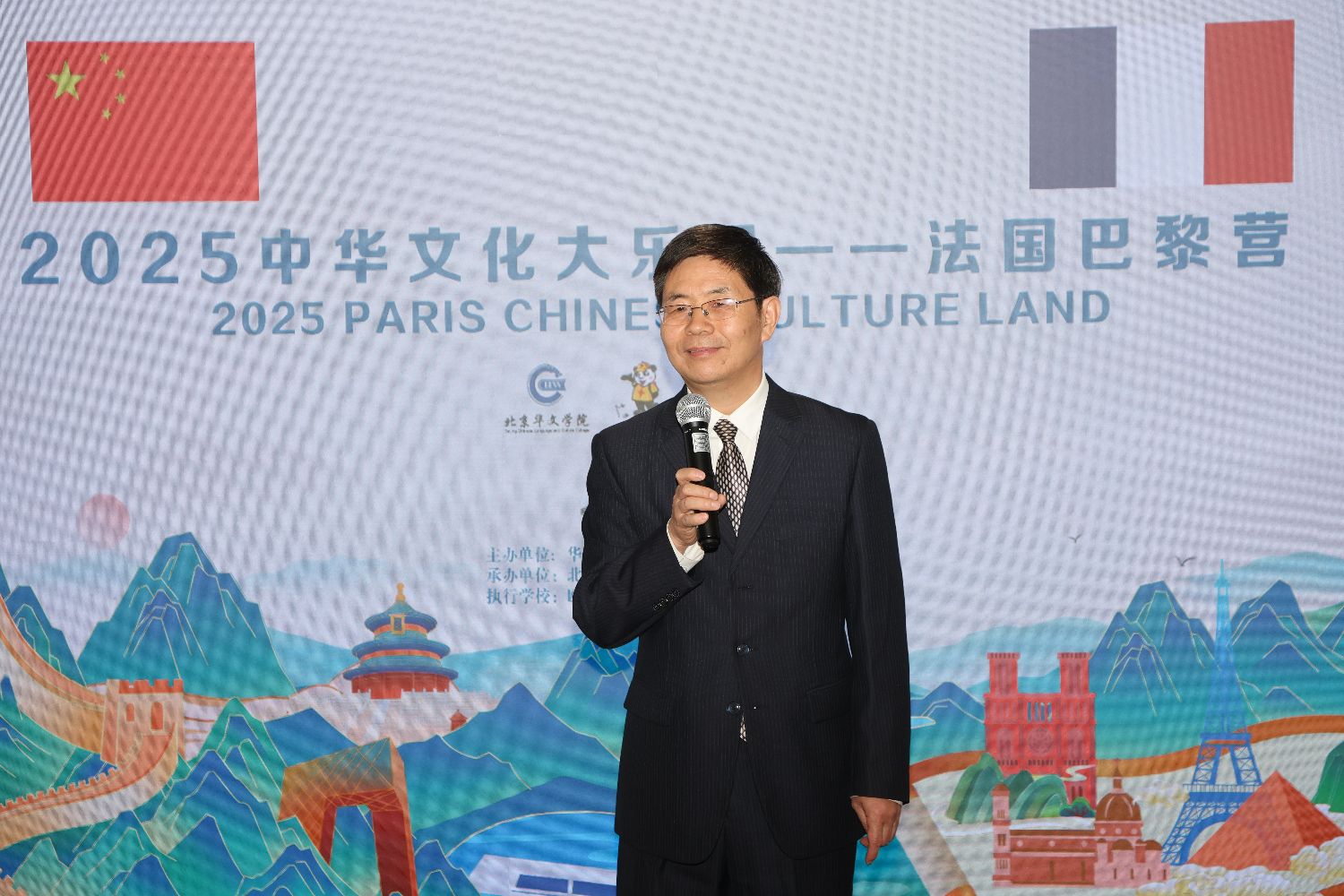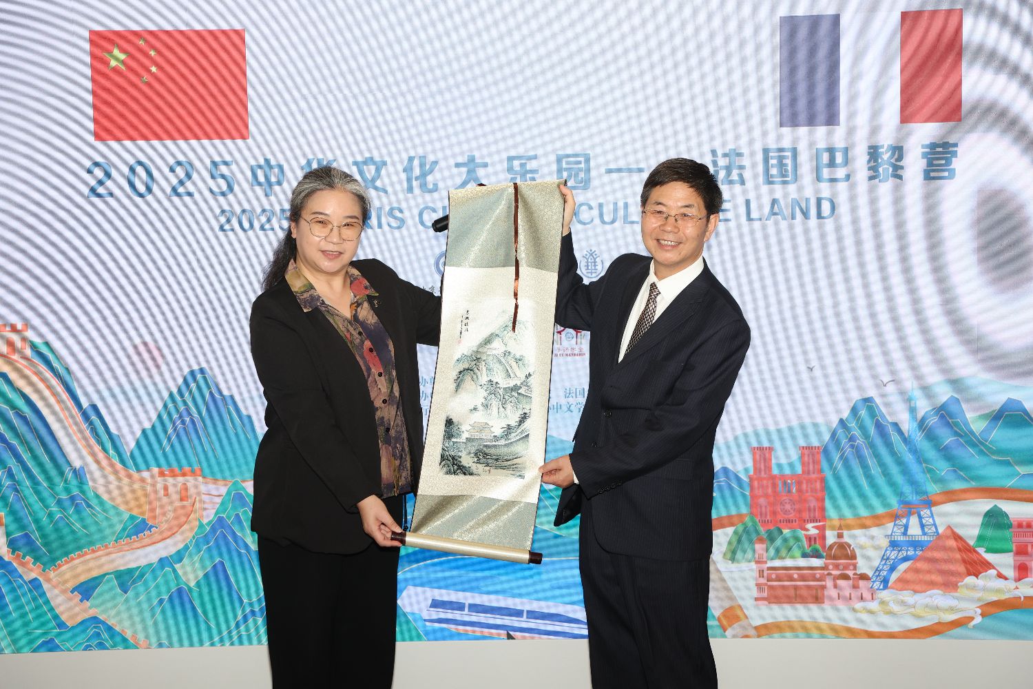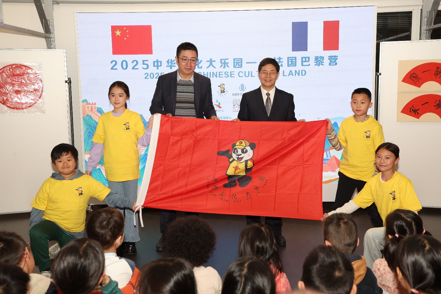 中国驻法国大使馆领侨处万磊参赞(左)与北京华文学院院务委员会副主任张鲁卿(右)共同给“2025中华文化大乐园——法国巴黎营”授旗。
