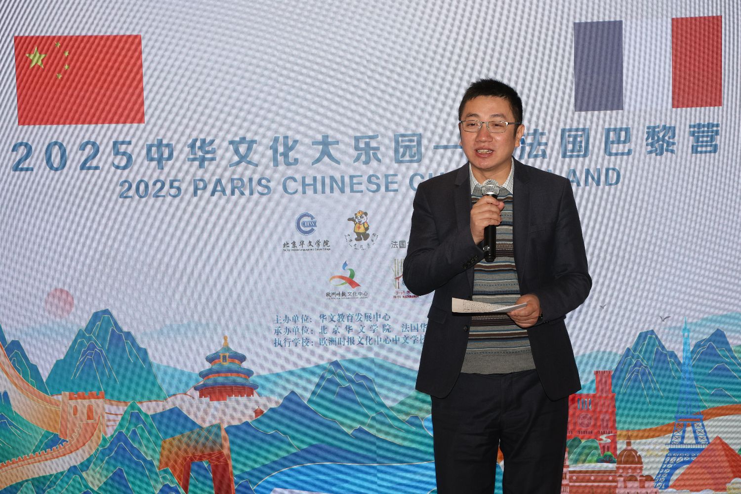 黄冠杰代表外出公务的欧洲时报文化传媒集团总裁、欧洲时报社社长钟诚,法国华文教育协会、各承办单位及参加这次大乐园活动的学生们对北京华文学院的领导和教师的到来表示热烈的欢迎和衷心的感谢,对2025中华文化大乐园顺利开营表示热烈祝贺,向报名参加这次活动的学生们表示祝福。黄冠杰表示,华文教育是一项“固根、塑魂、圆梦”的系统性工程,需要各方面的合力。长期以来,旅法侨界积极开办华文学校,托举这项工程,国务院侨办、中国驻法使馆给与了大力的支持和帮助,使得这项工程有序开展,并取得卓越的成果,让海外华裔青少年根有所住,魂有所托,梦有所寄,让这一文化血脉不断澎拜。“中华文化大乐园”是根据侨胞所需和所求由国务院侨务办公室推出的重要品牌活动,开展以来,让孩子们感受到高质量中文教学,沐浴更丰沛的文化阳光,极大提高了学生们的学习体验和对中华文化的黏性,成为深受海外华裔青少年喜欢的重要的中国文化体验方式。今年的中华文化大乐园,北京华文学院选派了多门类的精英教师,多层次的向学生们传授中华文化和技艺,学生们报名踊跃,从孩子们兴奋渴盼的眼神,我相信必将在他们中间再次掀起追随、探求中华文化的热潮。在不久的将来,我们将会高兴地看到今天播下的种子结出的硕果,不仅极大提高华裔青少年对中华文化的兴趣,增添他们的本领,也将锻炼他们身心,让他们不断成长为中法文化交流、中法友谊建设的栋梁。