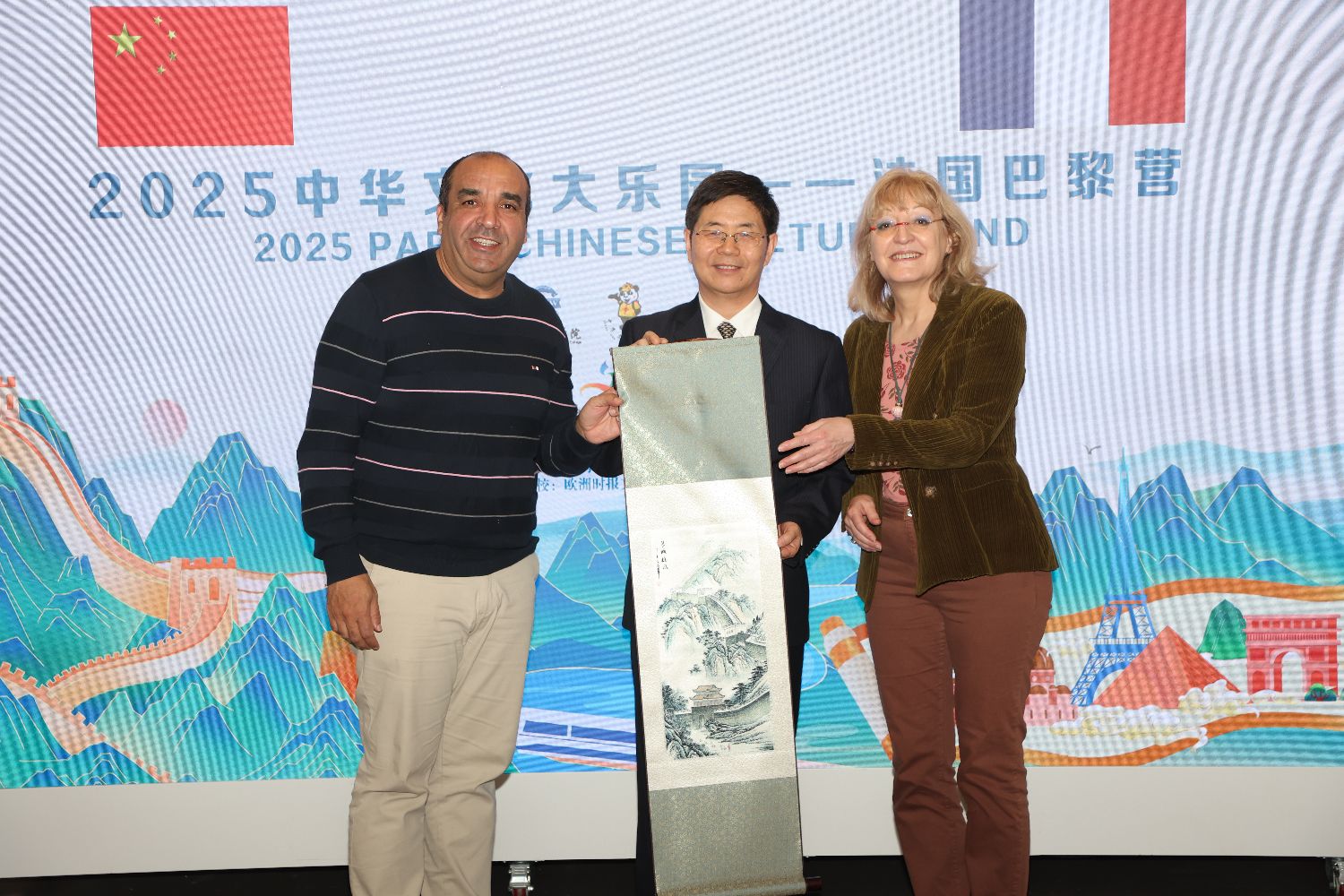 活动现场,万磊与张鲁卿共同给“2025中华文化大乐园——法国巴黎营”授旗,张鲁卿还分别向让蒂伊市政府、欧洲时报社、大乐园执行单位赠送了文创产品。