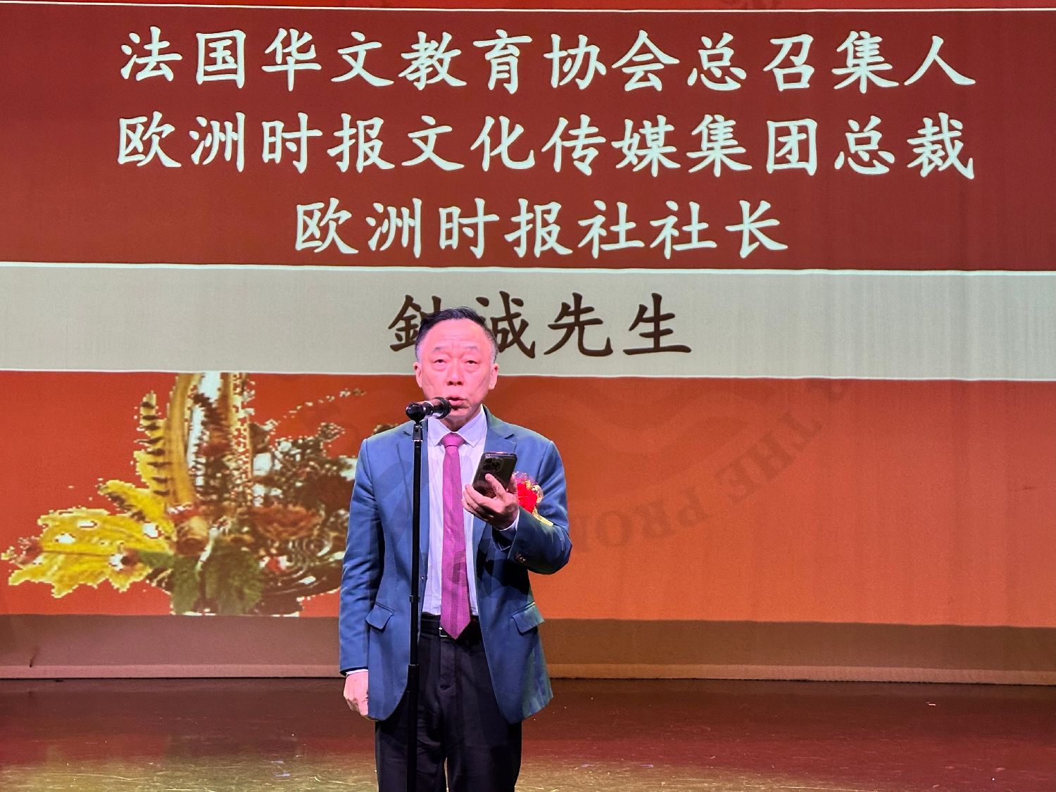 10月26日,法国华文教育协会总召集人、欧洲时报文化传媒集团总裁兼欧洲时报社社长钟诚致辞。(图片来源:中新社)