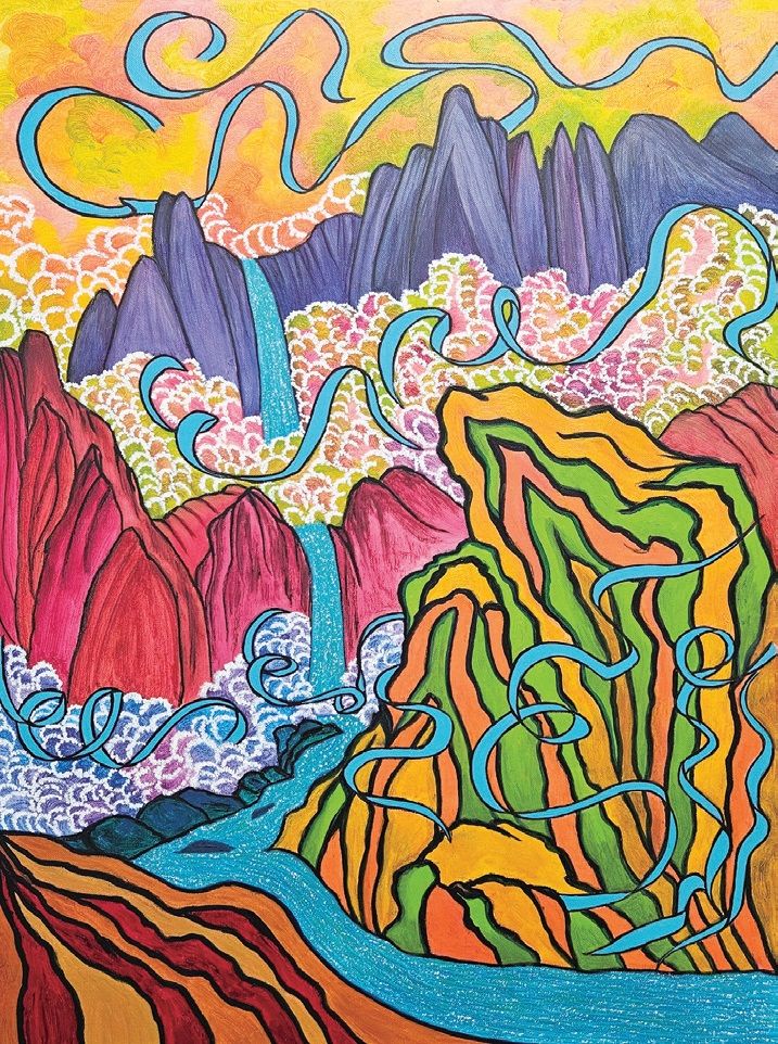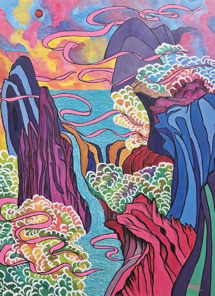 此次参展作品为“Oasis”系列两幅作品,艺术家通过鲜明的色彩与流动的线条,将自然景观转化为象征心灵节奏的意象,仿佛在层叠的山水与蜿蜒的云带中,描绘出内在世界的律动与宁静。“Oasis”不仅是一处外在的绿洲,更是一种心灵栖息之所,邀请观众透过画面,重新与自身的内心能量连接。