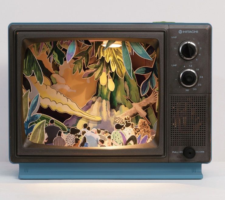 来自中国的艺术家刘力宁,此次展出作品为《电视机-观山》(2018年,装置,45×32×33cm)。作品以真实的旧电视机壳结合绘画与拼贴,构建出一个寓意深远的装置,探讨媒介在个人与社会中的地位与作用。