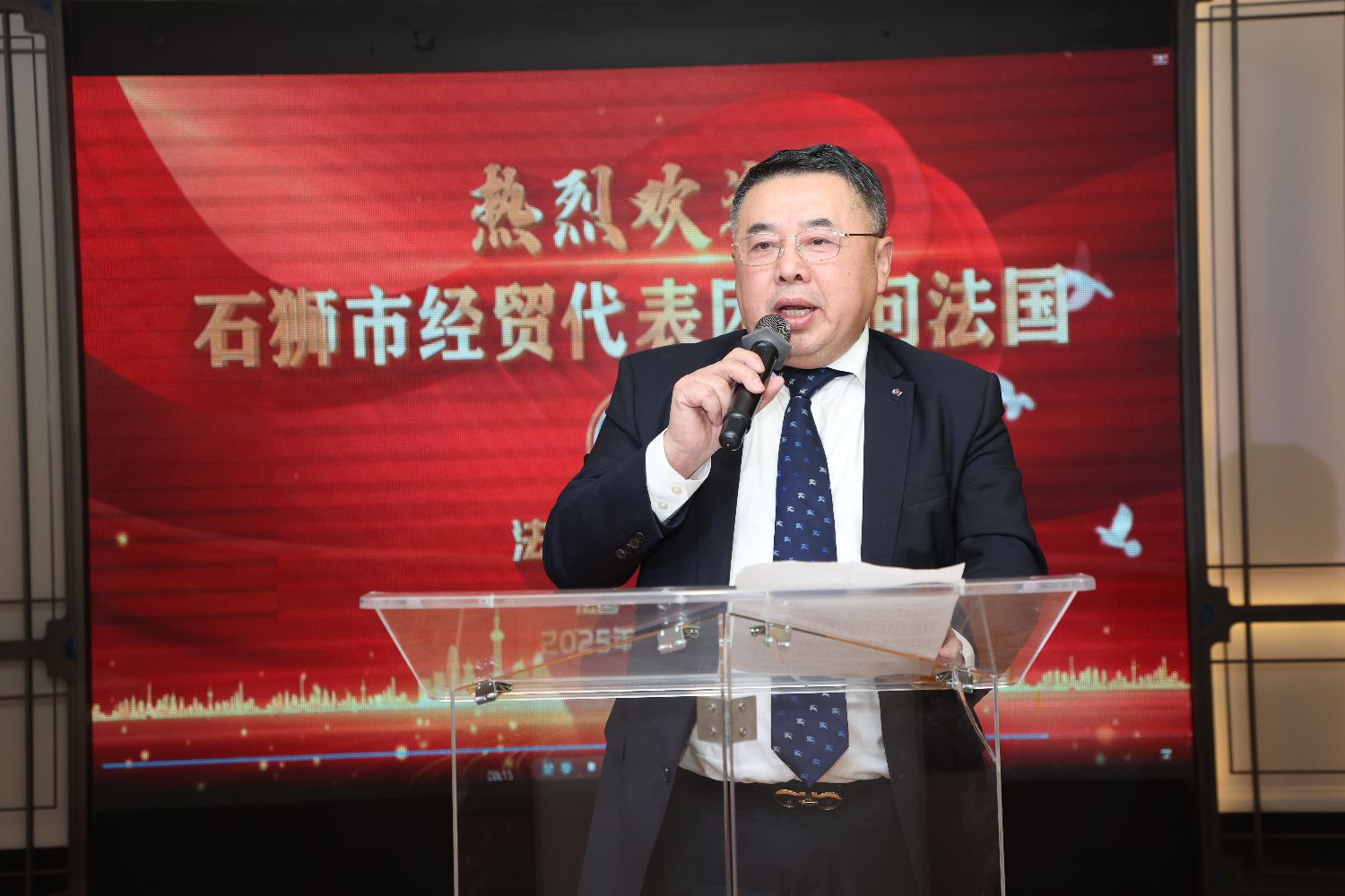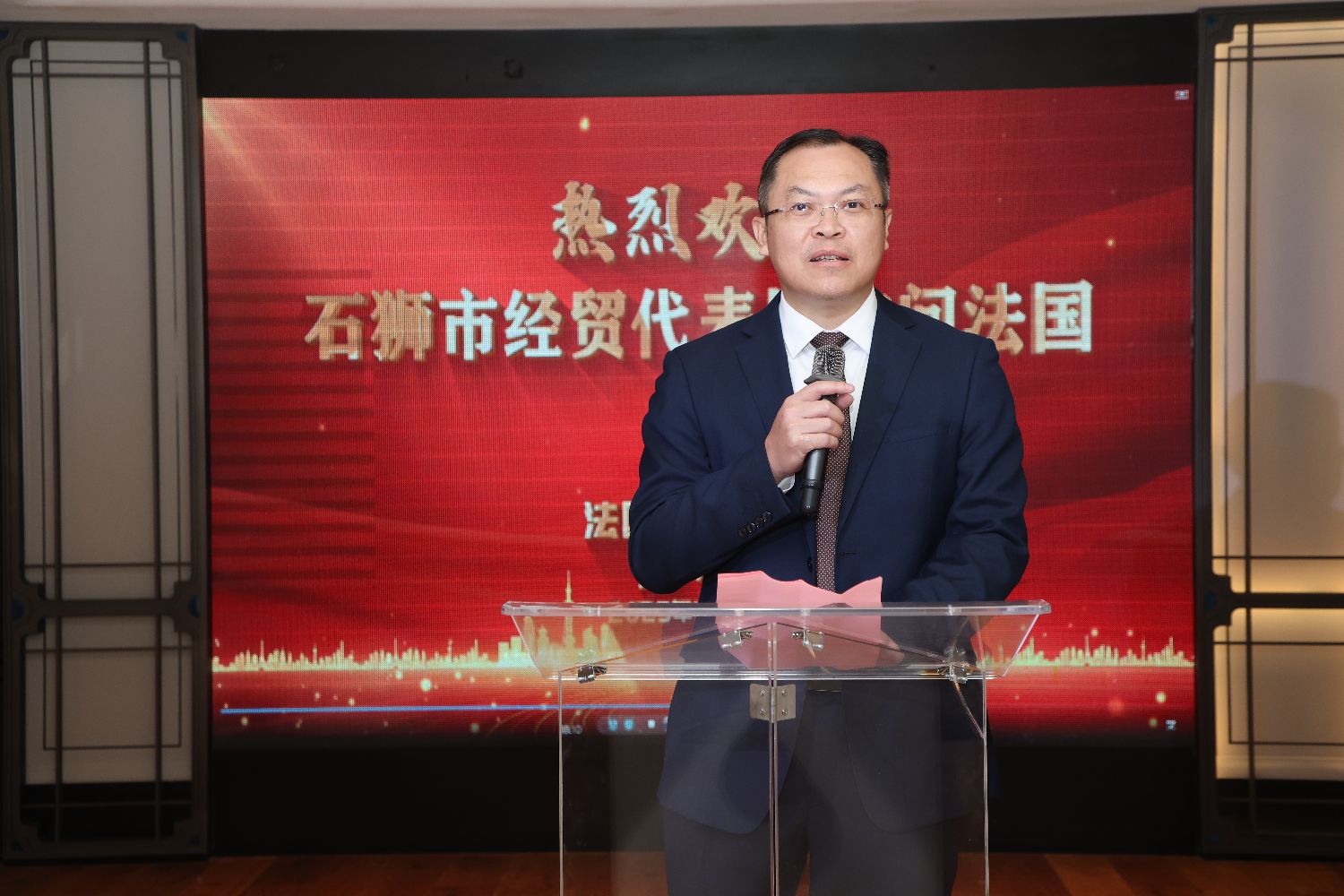 蔡君柱在致辞中表示,石狮,这座充满活力与智慧的城市,是福建民营经济和纺织服装产业的重要基地,也是改革开放的先行者。看到今天石狮代表团来到法国,我们倍感亲切,也倍感振奋。这是家乡开放发展的新象征,也是中法地方合作与经贸人文交流的新契机。旅法侨界一向心系家乡、情系祖国。我们在法国立足、奋斗,同时也积极为促进中法友好交流、推动中法经贸合作贡献力量。法国福建商会作为法国侨界中最具活力的商会之一,长期以来团结乡亲、服务侨胞、回馈社会,为促进中法经贸合作和家乡发展作出了突出贡献。我们相信,通过这次访问,石狮市与法国企业、侨团之间的交流合作将更加紧密,新的合作项目、新的友谊之桥一定会在中法两地之间不断延伸。