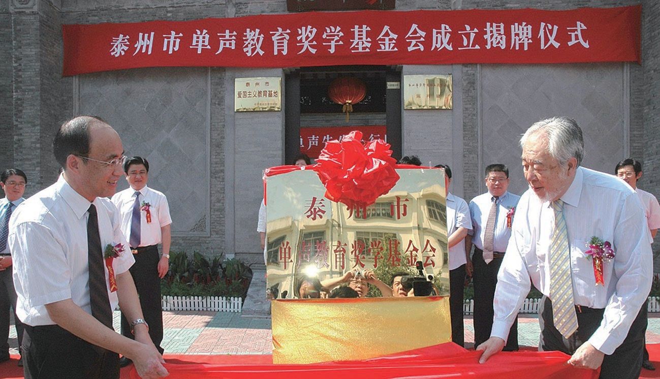 单声从未遗忘故土,他不善于高调,擅于行动,将对家乡的情义化作一代年轻人的教育之路。上世纪九十年代,单声两次偕夫人回江苏泰州商谈办学及落实房产之事。1998年,单声将政府发还的祖宅通过泰州市政府捐赠给大浦小学,作为孩子们的课外活动场所。2008年,他设立泰州市单声教育奖学金基金,奖励家乡生活贫困的优秀学子。