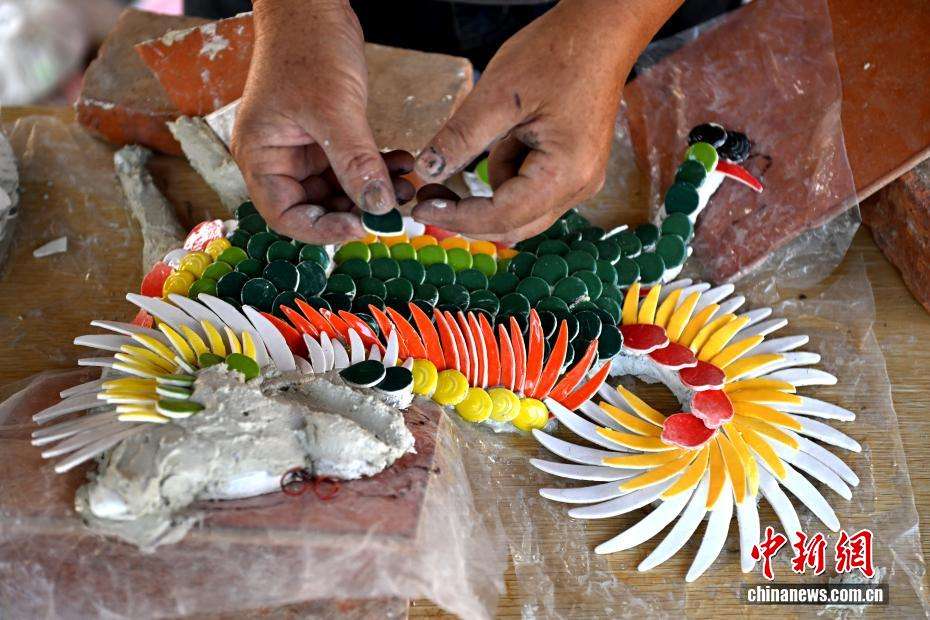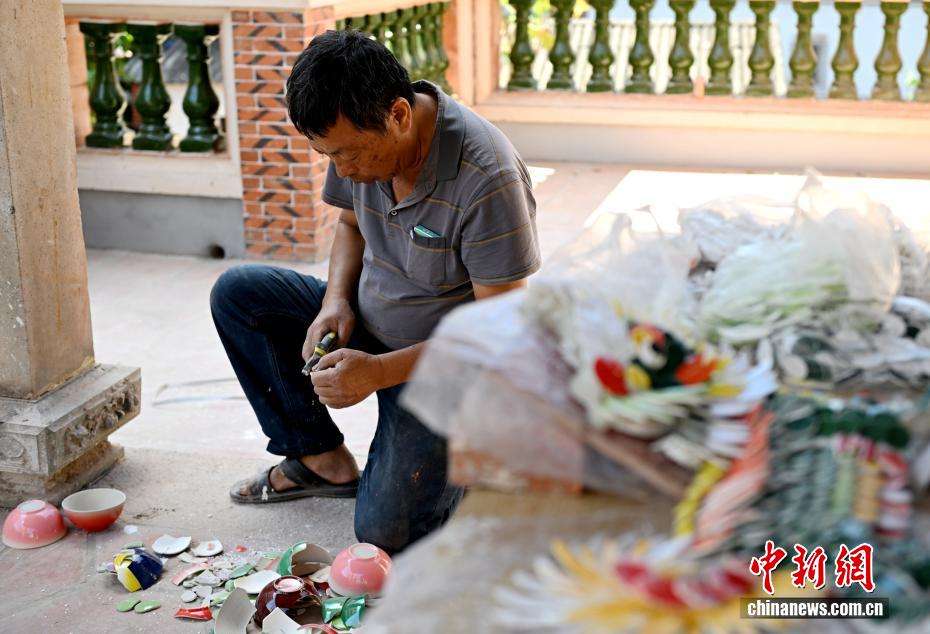 图为11月5日,陈和永正在制作剪瓷雕材料。陈和永出身闽南工匠世家,1977年正式随父学艺,在日复一日的实操中,逐渐掌握大木作、小木作、彩画、剪瓷雕、灰塑等传统技艺流程。(图片来源:中新网)