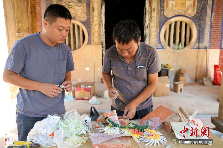 图为11月5日,陈和永(右)和大儿子陈劲奋(左)在厦门制作剪瓷雕。(图片来源:中新网)