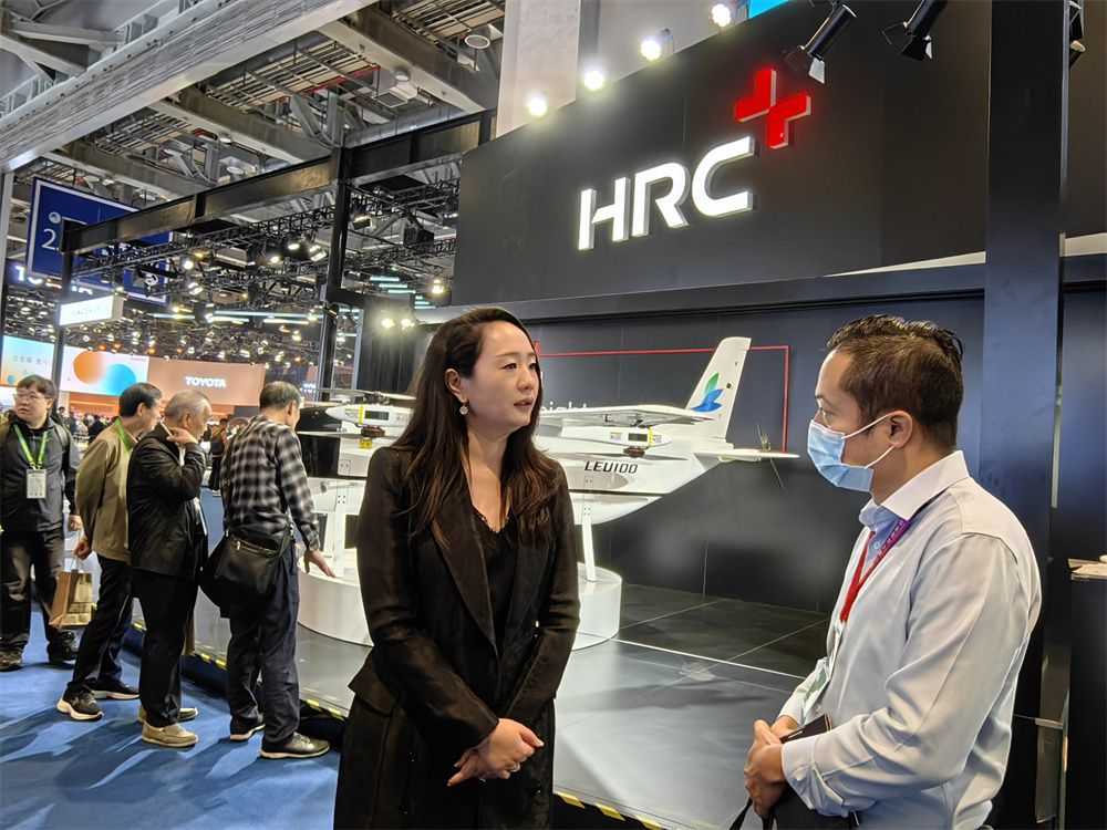 亨睿碳纤维(HRC)展位前,一款中型电动垂直起降物流无人机颇受关注。西班牙华侨、亨睿碳纤维市场总监陈文瑾站在一旁为观众介绍:“这款无人机能飞200公里,可用于山区救灾和城市物流。”