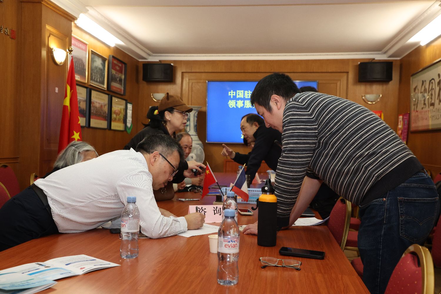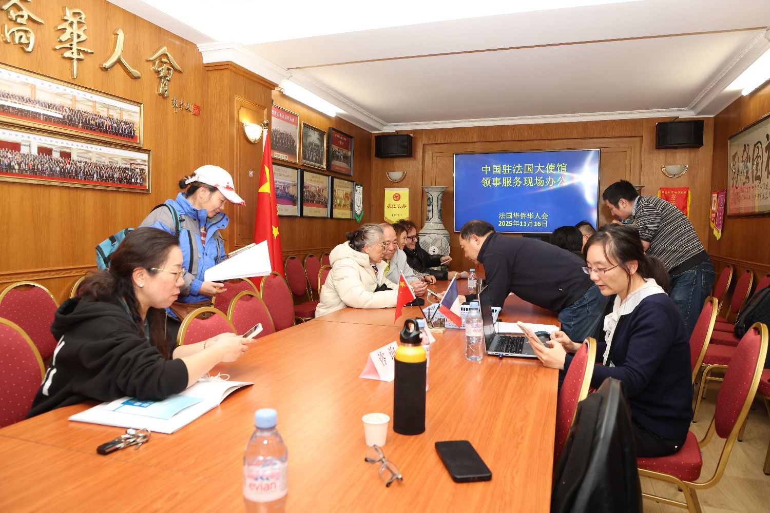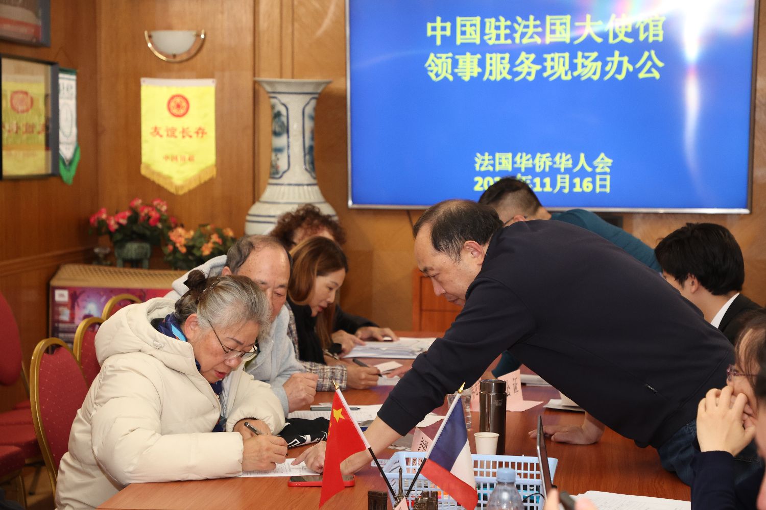 当地时间11月16日,中国驻法国大使馆领侨处赴巴黎中心区,在法国华侨华人会开展领事服务现场办公,为旅法侨胞提供咨询、护照/旅行证、养老金和公证业务的办理,并就侨胞在法国生活过程中遇到的问题进行答疑和解决。中国驻法国大使馆领侨处万磊参赞、副主任张慧舞及多名工作人员,法国华侨华人会候任主席郑金标,第一副主席丁仕定,常务副主席兼秘书长董德义等共同出席。