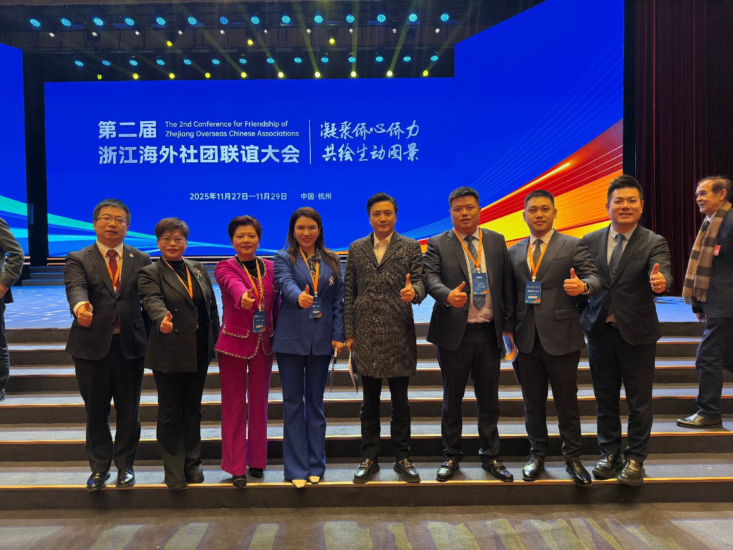 出席浙江海外华人社团联谊大会的部分侨领在会场合影。左三为法国华侨华人妇女联合会会长陈岚。