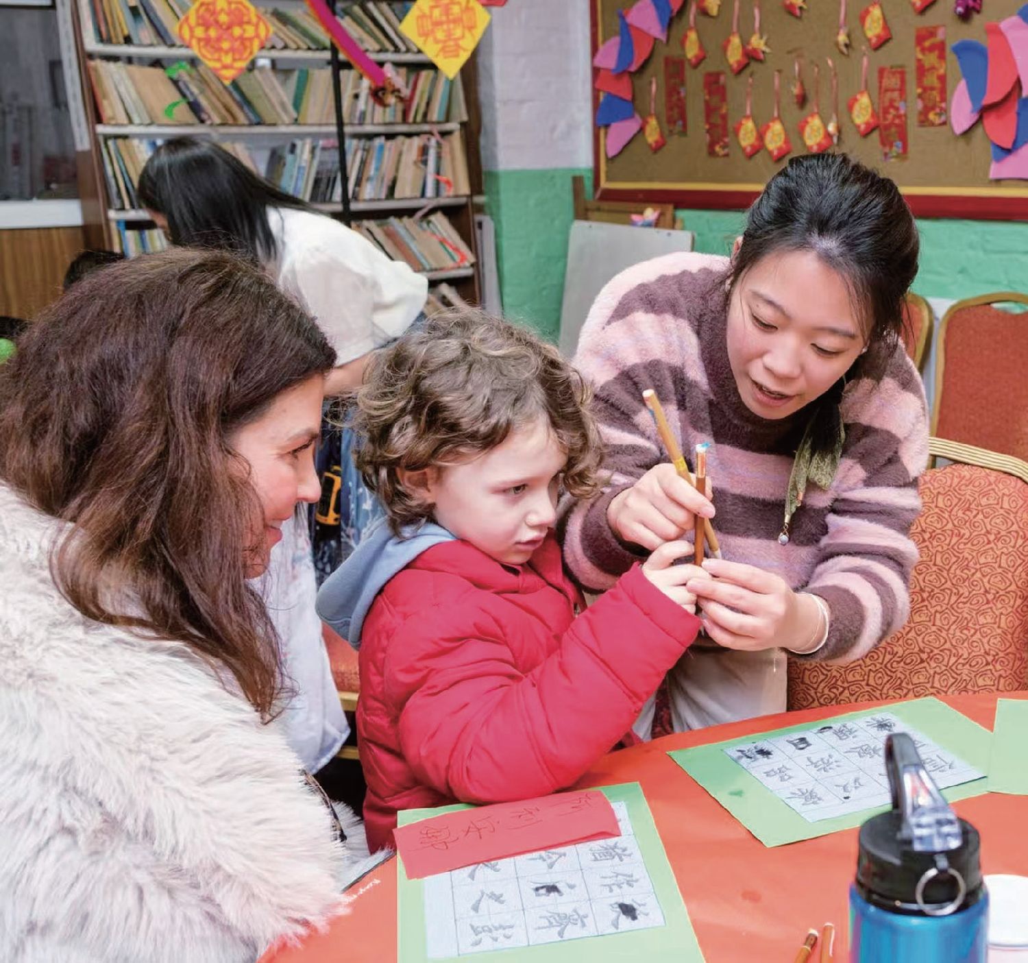 华声社举办的春节活动上,教师们引导本地儿童体验中华文化传统项目。
