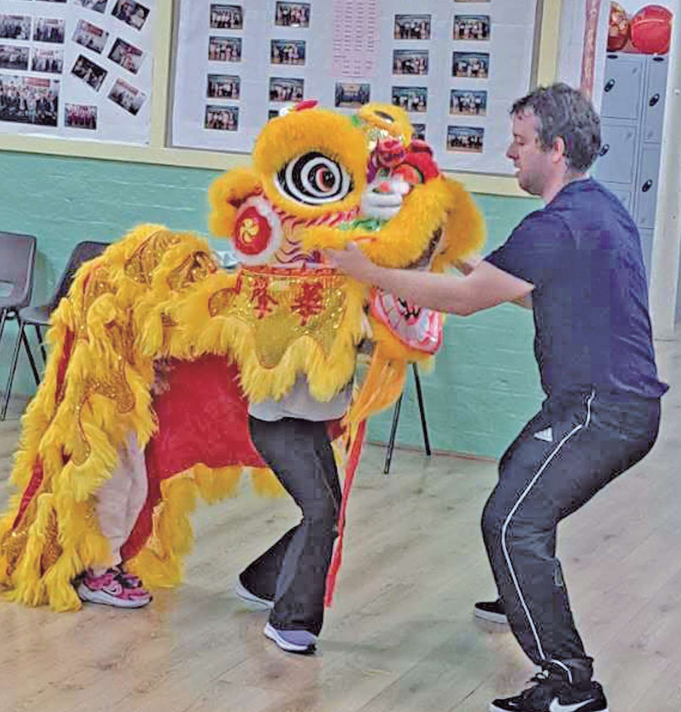 课外活动舞狮班上,学生学习舞狮。