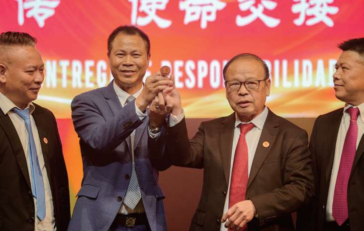 随后,典礼迎来最庄严的时刻:新老会长交接仪式。象征精神传承的火炬,由杨永典会长郑重交至潘文尧会长手中;象征责任担当的印章,则标志着第六届理事会正式履职。现场掌声不绝于耳,瑞安精神在这一刻得以延续。